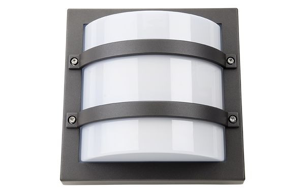 Viereckige Wandleuchte mit zusätzlichem Schutz der Abschirmung. Aus pulverbeschichtetem Druckgussaluminium. Abschirmung aus UV-stabilisiertem Opal-Polycarbonat. Zwei Kabeleinführungen, Möglichkeit für sichtbare oder verborgene Kabelführung mit der Möglichkeit zur Durchverdrahtung.
