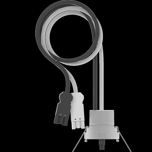 Deckeneinbau-Set für den Einbau in Hohldecken (Lochgröße Ø 68mm), Für 230V Sensor Serie DT, Mit vorkonfektionierten Anschlussleitungen für Wieland GST18®, Werkzeuglose Montage durch einfaches Aufrasten, Optional erhältlich ist ein alternatives Melder-Cover für eine deckenbündige Installation (Lochgröße Ø 85mm), Geräteart: Deckeneinbau-Set – Zubehör, Anschluss: WIELAND GST18i3, Abmessungen: Ø 68mm, H: 55mm, Kabellänge: 1,50m, Anwendungsbereich: Innenbereich, Gehäusefarbe: Opal, Gehäuse: UV-stabilisiertes Polycarbonat