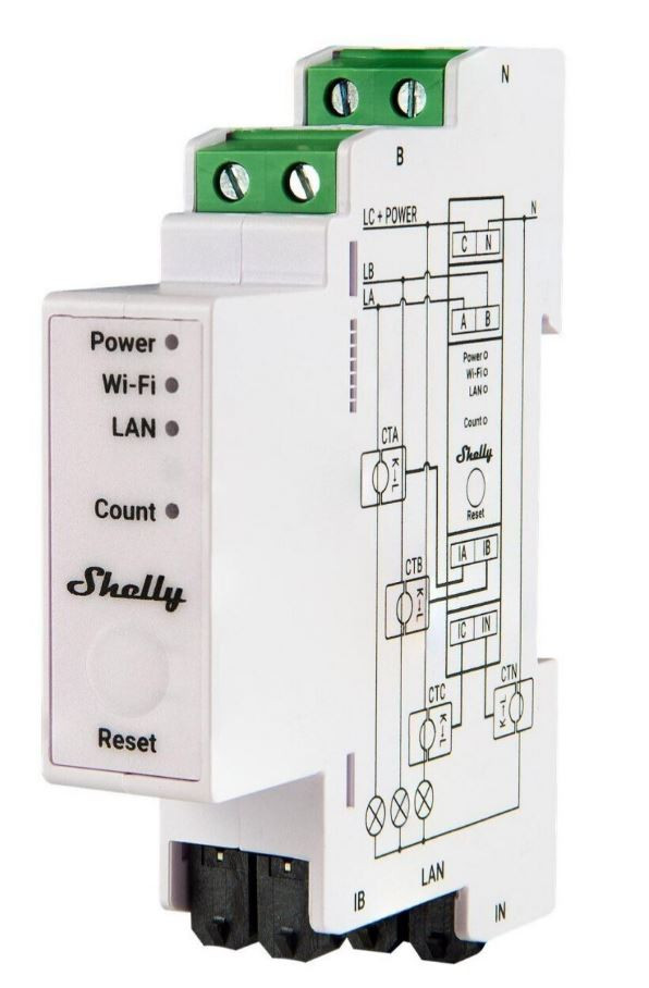 | Kurzbeschreibung | Shelly · Hutschiene · "Pro 3EM 120A" · Stromzähler · inkl. 3x 120A Klemmen · Messfunktion · WLAN · LAN · BT |
