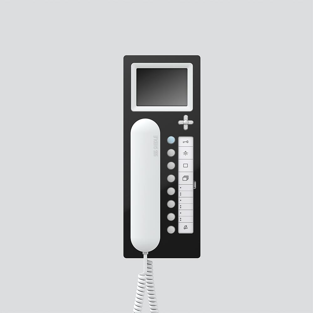 Access Haustelefon mit Türöffnertaste und 7 weiteren Tasten mit 2-farbiger Status-LED. Alle Tasten sind frei programmierbar. Das Display zeigt die grafische Menüoberfläche, jedoch kein Kamerabild. Upgrade zur vollwertigen Videostation möglich.