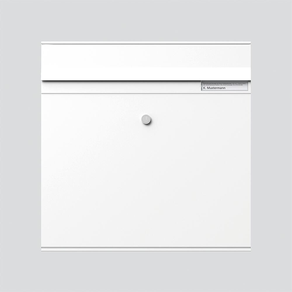 Großraumbriefkasten 346,5 x 360 x 103 mm mit Durchwurf 355 x 32,5 mm. Wasserdichte, doppelwandige Kunststoff-Klimabox mit Postauflagerost, stabiler vorderseitiger Entnahmetür mit Schließzylinder, die in einem vorbestimmten Winkel automatisch abbremst. Namensschild unter der Einwurfklappe, auf Wunsch auch mit rückseitiger Entnahmemöglichkeit lieferbar.