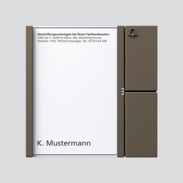 mit Namensschildtasche und 1 separaten Ruftaste mit Glockensymbol. Namensschildgröße 65 x 94 mm Ruftaste rechteckig 24 x 49 mm LED-Beleuchtung 12 V AC 25 mA.