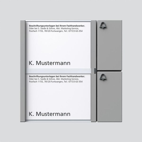 Abmessungen: 99 x 99 mm Bus-Tasten-Modul mit Namensschildtasche, 2 Namensschildern und 2 separaten Ruftasten mit Glockensymbol.