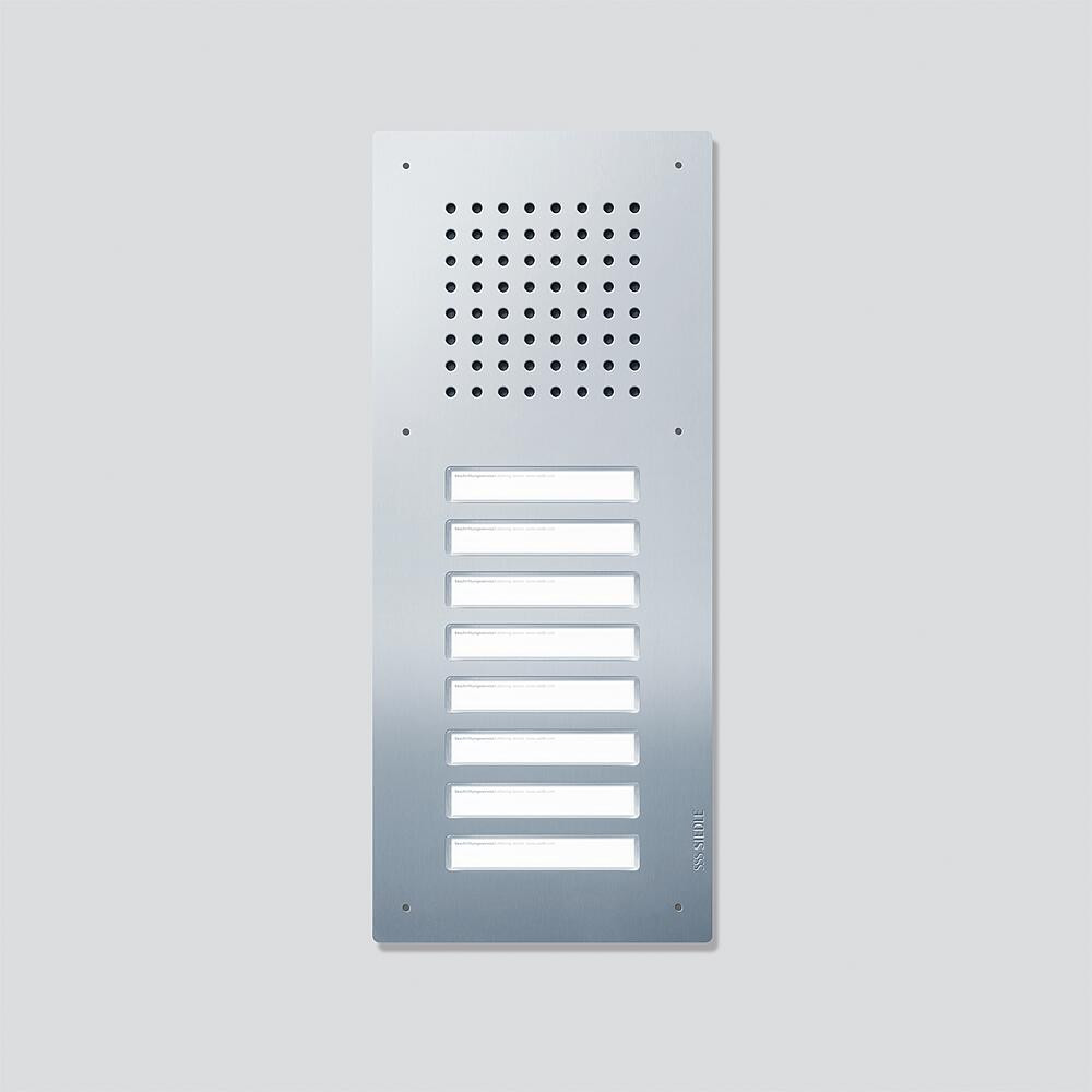 • 8 Ruftasten mit hinterleuchtetem Namensschild, frontseitig auswechselbar, akustische Rückmeldung beim Betätigen einer Ruftaste aktivierbar