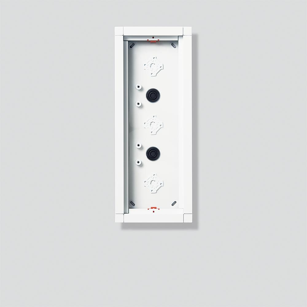 Aufputzgehäuse aus Aluminium-Strangpressprofil mit Zink-Druckguss-Eckverbindern und Stahlblechbodenplatte für 3 Funktionsmodule.