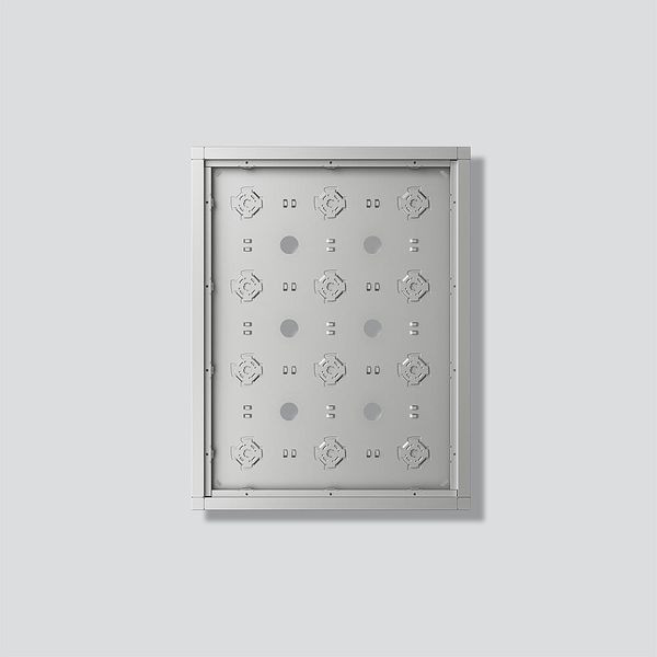 Aufputzgehäuse aus Aluminium-Strangpressprofil mit Zink-Druckguss-Eckverbindern und Stahlblechbodenplatte für 12 Funktionsmodule.