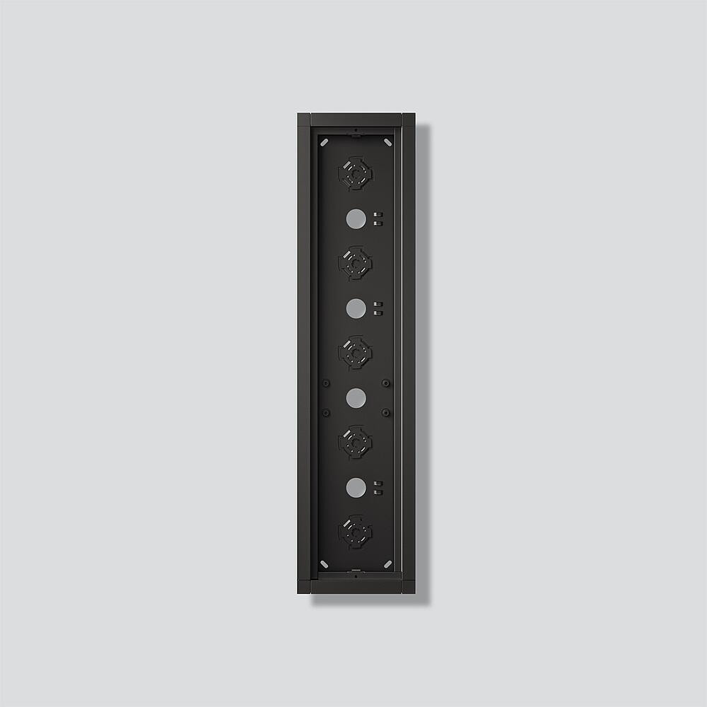 Aufputzgehäuse aus Aluminium-Strangpressprofil mit Zink-Druckguss-Eckverbindern und Stahlblechbodenplatte für 5 Funktionsmodule.