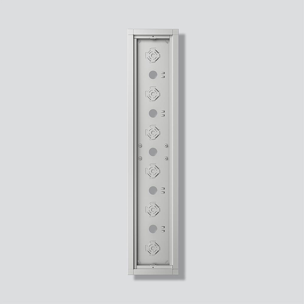 Aufputzgehäuse aus Aluminium-Strangpressprofil mit Zink-Druckguss-Eckverbindern und Stahlblechbodenplatte für 6 Funktionsmodule.