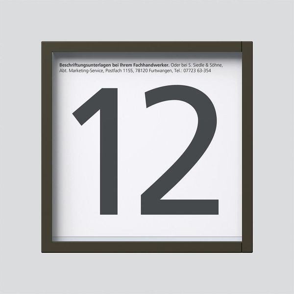 mit Kassette und Beschriftungsfeld (91 x 84 mm), für Hausnummer, Piktogramme, Geschäftszeiten etc. hintergrundbeleuchtet mit LED 12 V AC 25 mA.