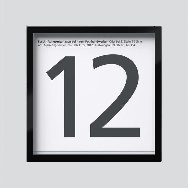 mit Kassette und Beschriftungsfeld (91 x 84 mm), für Hausnummer, Piktogramme, Geschäftszeiten etc. hintergrundbeleuchtet mit LED 12 V AC 25 mA.
