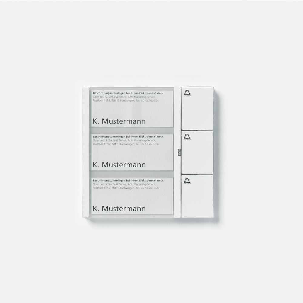 Abmessungen 99 x 99 mm Tasten-Modul mit Namensschildtasche, 3 Namensschildern und 3 separaten Ruftasten.