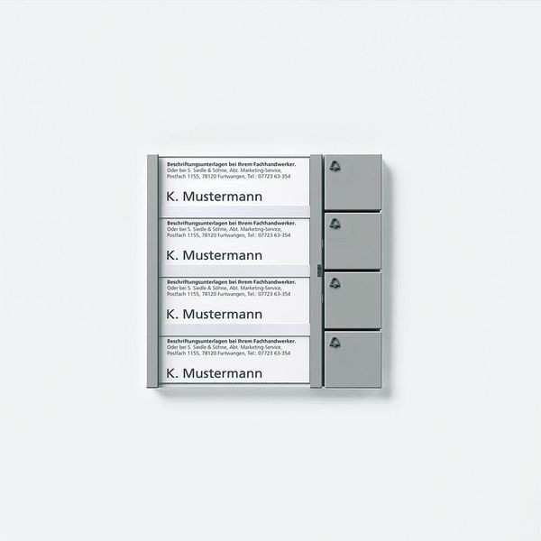Abmessungen 99 x 99 mm Tasten-Modul mit Namensschildtasche, 4 Namensschildern und 4 separaten Ruftasten.