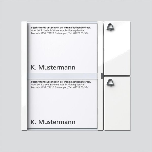 Tasten-Modul mit Namensschildtasche, 2 Namensschildern und 2 separaten Ruftasten mit Glockensymbol.