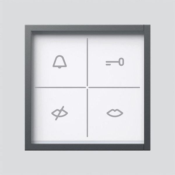 Zustandsanzeige-Modul mit optischer und akustischer Rückmeldung. Jeweils ein LED-hinterleuchtetes Symbol signalisiert die Zustände „Ruf“, „Nicht erreichbar“, „Sprechen“ und „Türöffnen“.