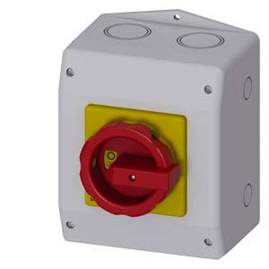 Schutzart IP 65, Betätigungselement rot/gelb SENTRON, Lasttrennschalter 3LD, Not-Aus-Schalter, 3- polig, Iu: 63 A, Betriebsleistung / bei AC-23 A bei 400V: 22 kW, Isolierstoff- Kapselung für metrische Verschraubung, Drehantrieb, rot/gelb Haupt- und NOT-AUS-Schalter SENTRON 3LD2 für das sichere Abschalten von Lasten in vielen Bereichen, z.B. für Drehstrommotoren, Klima- und Lüftungsanlagen, in Be- und Verarbeitungsmaschinen des Maschinen- und Förderanlagenbaus, in der chemischen oder in der Nahrungsmittel- und Getränkeindustrie. Modularer Aufbau, schnelle einfache Montage von Hilfsschaltern, N-PE-Klemme oder 4. Pol. Optimale Netztrennung von 16 A bis 250 A durch Abschließbarkeit des Drehantriebes. Schutzart bis IP 65 mit gekapseltem Gehäusefür Anwendungen im Freien. Vielseitig und weltweit einsetzbar dank internationaler IEC-, UL-, CCC- sowie Schiffbau-Approbationen. Die Haupt- und NOT-AUS-Schalter 3LD sind in vielfältigen Varianten erhältlich für Frontbefestigung, Montageplatte, Hutschiene oder Verteilereinbau, wahlweise mit Direkt- oder Türkupplungs-Drehantrieb. Bei 3LD2 sind auch Varianten für Gleichstromanwendungen verfügbar. Haupt- und NOT-AUS-Schalter 3LD - Durchgängige Sicherheit für Anwender und Systeme.
