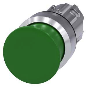 Pilzdrucktaster, 22 mm, rund, Metall, hochglanz, grün, 30 mm, tastend Pilzdrucktaster SIRIUS ACT mit großer Handhabe zur komfortablen Betätigung mit der ganzen Hand. Unter dem Markennamen SIRIUS ACT bietet Siemens ein einzigartiges Portfolio an Befehls- und Meldegeräten mit weltweiten Produkt-Zulassungen in drei modernen Designreihen aus robustem Echtmetall und hochwertigem Kunststoff. Das innovative Aufschnappkonzept vereinfacht die Montage so weit, dass dafür nur eine Hand und kein Spezialwerkzeug erforderlich ist. Als Montagebohrungen genügen nutfreie Löcher, da bereits ein 100%iger Verdrehschutz integriert ist. Dank der durchgängig hohen Schutzart sind die robusten Geräte industrietauglich und für den Außeneinsatz geeignet. Sogar die Reinigung mit Hochdruckstrahl ist möglich. Weder Staub, Öle noch aggressive Laugen können den zuverlässigen Betrieb stören. Neben der Standardverdrahtung können die meisten Geräte auch über PROFINET, AS-Interface oder IO-Link an die Steuerung angebunden werden. Damit reduzieren Sie Ihren Verdrahtungsaufwand, minimieren Fehlerquellen und gewinnen mehr Flexibilität. Komfortabel unterstützt der grafische Online-Konfigurator bei Auswahl und Bestellung von Einzelgeräten, Gehäusen und Beschriftungen. Umfangreiche Dokumentation (z.B. Handbuch, 3D-Daten, Anschlussdiagramm) ist verfügbar. Lieferbare Ausführungen: 30/40/60 mm Pilz-Durchmesser, mehrere Farben, beleuchtet/unbeleuchtet, verrastende/tastende Betätigung, Zug-/Drehentriegelung. Hinweis: Einzelgerät, Halter und Module bitte extra bestellen. SIRIUS ACT - Performance in Action beim Befehlen und Melden. Einfach montiert, einfach stark, einfach perfekt.