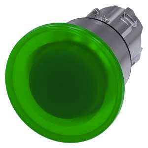 Leuchtpilzdrucktaster, 22 mm, rund, Metall, hochglanz, grün, 40 mm, verrastend, Zugentriegelung Pilzdrucktaster SIRIUS ACT mit großer Handhabe zur komfortablen Betätigung mit der ganzen Hand. Unter dem Markennamen SIRIUS ACT bietet Siemens ein einzigartiges Portfolio an Befehls- und Meldegeräten mit weltweiten Produkt-Zulassungen in drei modernen Designreihen aus robustem Echtmetall und hochwertigem Kunststoff. Das innovative Aufschnappkonzept vereinfacht die Montage so weit, dass dafür nur eine Hand und kein Spezialwerkzeug erforderlich ist. Als Montagebohrungen genügen nutfreie Löcher, da bereits ein 100%iger Verdrehschutz integriert ist. Dank der durchgängig hohen Schutzart sind die robusten Geräte industrietauglich und für den Außeneinsatz geeignet. Sogar die Reinigung mit Hochdruckstrahl ist möglich. Weder Staub, Öle noch aggressive Laugen können den zuverlässigen Betrieb stören. Neben der Standardverdrahtung können die meisten Geräte auch über PROFINET, AS-Interface oder IO-Link an die Steuerung angebunden werden. Damit reduzieren Sie Ihren Verdrahtungsaufwand, minimieren Fehlerquellen und gewinnen mehr Flexibilität. Komfortabel unterstützt der grafische Online-Konfigurator bei Auswahl und Bestellung von Einzelgeräten, Gehäusen und Beschriftungen. Umfangreiche Dokumentation (z.B. Handbuch, 3D-Daten, Anschlussdiagramm) ist verfügbar. Lieferbare Ausführungen: 30/40/60 mm Pilz-Durchmesser, mehrere Farben, beleuchtet/unbeleuchtet, verrastende/tastende Betätigung, Zug-/Drehentriegelung. Hinweis: Einzelgerät, Halter und Module bitte extra bestellen. SIRIUS ACT - Performance in Action beim Befehlen und Melden. Einfach montiert, einfach stark, einfach perfekt.