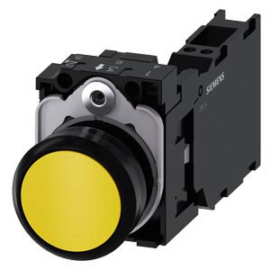 Drucktaster, 22 mm, rund, Kunststoff, gelb, Druckknopf, flach, tastend, mit Halter 1S+1Ö, Federzuganschluss, Drucktaster SIRIUS ACT zur Schaltung und Steuerung elektrischer Verbraucher. Unter dem Markennamen SIRIUS ACT bietet Siemens ein einzigartiges Portfolio an Befehls- und Meldegeräten mit weltweiten Produkt-Zulassungen in drei modernen Designreihen aus robustem Echtmetall und hochwertigem Kunststoff. Das innovative Aufschnappkonzept vereinfacht die Montage so weit, dass dafür nur eine Hand und kein Spezialwerkzeug erforderlich ist. Als Montagebohrungen genügen nutfreie Löcher, da bereits ein 100%iger Verdrehschutz integriert ist. Dank der durchgängig hohen Schutzart sind die robusten Geräte industrietauglich und für den Außeneinsatz geeignet. Sogar die Reinigung mit Hochdruckstrahl ist möglich. Weder Staub, Öle noch aggressive Laugen können den zuverlässigen Betrieb stören. Neben der Standardverdrahtung können die meisten Geräte auch über PROFINET, AS-Interface oder IO-Link an die Steuerung angebunden werden. Damit reduzieren Sie Ihren Verdrahtungsaufwand, minimieren Fehlerquellen und gewinnen mehr Flexibilität. Komfortabel unterstützt der grafische Online-Konfigurator bei Auswahl und Bestellung von Einzelgeräten, Gehäusen und Beschriftungen. Umfangreiche Dokumentation (z.B. Handbuch, 3D-Daten, Anschlussdiagramm) ist verfügbar. Lieferbare Ausführungen: mehrere Farben, beleuchtet/unbeleuchtet, mit/ohne Beschriftung, verrastende/tastende Betätigung, verschiedene Druckknopf- und Frontringhöhen. Hinweis: Komplettgerät, Lieferung inklusive Halter und Module. SIRIUS ACT - Performance in Action beim Befehlen und Melden. Einfach montiert, einfach stark, einfach perfekt.