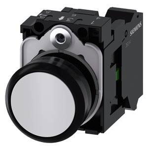 Drucktaster, 22 mm, rund, Kunststoff, weiß, Druckknopf, flach, tastend, mit Halter 1S, Federzuganschluss Drucktaster SIRIUS ACT zur Schaltung und Steuerung elektrischer Verbraucher. Unter dem Markennamen SIRIUS ACT bietet Siemens ein einzigartiges Portfolio an Befehls- und Meldegeräten mit weltweiten Produkt-Zulassungen in drei modernen Designreihen aus robustem Echtmetall und hochwertigem Kunststoff. Das innovative Aufschnappkonzept vereinfacht die Montage so weit, dass dafür nur eine Hand und kein Spezialwerkzeug erforderlich ist. Als Montagebohrungen genügen nutfreie Löcher, da bereits ein 100%iger Verdrehschutz integriert ist. Dank der durchgängig hohen Schutzart sind die robusten Geräte industrietauglich und für den Außeneinsatz geeignet. Sogar die Reinigung mit Hochdruckstrahl ist möglich. Weder Staub, Öle noch aggressive Laugen können den zuverlässigen Betrieb stören. Neben der Standardverdrahtung können die meisten Geräte auch über PROFINET, AS-Interface oder IO-Link an die Steuerung angebunden werden. Damit reduzieren Sie Ihren Verdrahtungsaufwand, minimieren Fehlerquellen und gewinnen mehr Flexibilität. Komfortabel unterstützt der grafische Online-Konfigurator bei Auswahl und Bestellung von Einzelgeräten, Gehäusen und Beschriftungen. Umfangreiche Dokumentation (z.B. Handbuch, 3D-Daten, Anschlussdiagramm) ist verfügbar. Lieferbare Ausführungen: mehrere Farben, beleuchtet/unbeleuchtet, mit/ohne Beschriftung, verrastende/tastende Betätigung, verschiedene Druckknopf- und Frontringhöhen. Hinweis: Komplettgerät, Lieferung inklusive Halter und Module. SIRIUS ACT - Performance in Action beim Befehlen und Melden. Einfach montiert, einfach stark, einfach perfekt.
