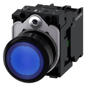 Leuchtdrucktaster, 22 mm, rund, Kunststoff, blau, Druckknopf, flach, tastend, mit Halter, 1S, LED-Modul mit integrierter LED AC/DC 24V, Schraubanschluss Leuchtdrucktaster SIRIUS ACT zur Schaltung und Steuerung elektrischer Verbraucher. Unter dem Markennamen SIRIUS ACT bietet Siemens ein einzigartiges Portfolio an Befehls- und Meldegeräten mit weltweiten Produkt-Zulassungen in drei modernen Designreihen aus robustem Echtmetall und hochwertigem Kunststoff. Das innovative Aufschnappkonzept vereinfacht die Montage so weit, dass dafür nur eine Hand und kein Spezialwerkzeug erforderlich ist. Als Montagebohrungen genügen nutfreie Löcher, da bereits ein 100%iger Verdrehschutz integriert ist. Dank der durchgängig hohen Schutzart sind die robusten Geräte industrietauglich und für den Außeneinsatz geeignet. Sogar die Reinigung mit Hochdruckstrahl ist möglich. Weder Staub, Öle noch aggressive Laugen können den zuverlässigen Betrieb stören. Neben der Standardverdrahtung können die meisten Geräte auch über PROFINET, AS-Interface oder IO-Link an die Steuerung angebunden werden. Damit reduzieren Sie Ihren Verdrahtungsaufwand, minimieren Fehlerquellen und gewinnen mehr Flexibilität. Komfortabel unterstützt der grafische Online-Konfigurator bei Auswahl und Bestellung von Einzelgeräten, Gehäusen und Beschriftungen. Umfangreiche Dokumentation (z.B. Handbuch, 3D-Daten, Anschlussdiagramm) ist verfügbar. Lieferbare Ausführungen: mehrere Farben, beleuchtet/unbeleuchtet, mit/ohne Beschriftung, verrastende/tastende Betätigung, verschiedene Druckknopf- und Frontringhöhen. Hinweis: Komplettgerät, Lieferung inklusive Halter und Module. SIRIUS ACT - Performance in Action beim Befehlen und Melden. Einfach montiert, einfach stark, einfach perfekt.