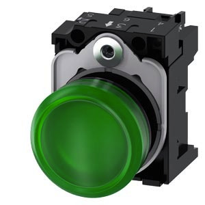 Leuchtmelder, 22 mm, rund, Kunststoff, grün, Linse, glatt, mit Halter, LED-Modul, mit integrierter LED AC/DC 24V, Schraubanschluss Leuchtmelder SIRIUS ACT zur Signalisierung von Schaltzuständen oder Störungen in Anlagen mit brillianter Leuchtkraft dank energieeffizienter LED-Technologie. Unter dem Markennamen SIRIUS ACT bietet Siemens ein einzigartiges Portfolio an Befehls- und Meldegeräten mit weltweiten Produkt-Zulassungen in drei modernen Designreihen aus robustem Echtmetall und hochwertigem Kunststoff. Das innovative Aufschnappkonzept vereinfacht die Montage so weit, dass dafür nur eine Hand und kein Spezialwerkzeug erforderlich ist. Als Montagebohrungen genügen nutfreie Löcher, da bereits ein 100%iger Verdrehschutz integriert ist. Dank der durchgängig hohen Schutzart sind die robusten Geräte industrietauglich und für den Außeneinsatz geeignet. Sogar die Reinigung mit Hochdruckstrahl ist möglich. Weder Staub, Öle noch aggressive Laugen können den zuverlässigen Betrieb stören. Neben der Standardverdrahtung können die meisten Geräte auch über PROFINET, AS-Interface oder IO-Link an die Steuerung angebunden werden. Damit reduzieren Sie Ihren Verdrahtungsaufwand, minimieren Fehlerquellen und gewinnen mehr Flexibilität. Komfortabel unterstützt der grafische Online-Konfigurator bei Auswahl und Bestellung von Einzelgeräten, Gehäusen und Beschriftungen. Umfangreiche Dokumentation (z.B. Handbuch, 3D-Daten, Anschlussdiagramm) ist verfügbar. Lieferbare Ausführungen: mehrere Farben, verschiedene Spannungsvarianten. Hinweis: Komplettgerät, Lieferung inklusive Halter und Module. SIRIUS ACT - Performance in Action beim Befehlen und Melden. Einfach montiert, einfach stark, einfach perfekt.