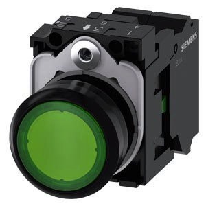 Leuchtdrucktaster, 22 mm, rund, Kunststoff, grün, Druckknopf, flach, tastend, mit Halter, 1S, LED-Modul mit integrierter LED AC 230 V, Federzuganschluss Leuchtdrucktaster SIRIUS ACT zur Schaltung und Steuerung elektrischer Verbraucher. Unter dem Markennamen SIRIUS ACT bietet Siemens ein einzigartiges Portfolio an Befehls- und Meldegeräten mit weltweiten Produkt-Zulassungen in drei modernen Designreihen aus robustem Echtmetall und hochwertigem Kunststoff. Das innovative Aufschnappkonzept vereinfacht die Montage so weit, dass dafür nur eine Hand und kein Spezialwerkzeug erforderlich ist. Als Montagebohrungen genügen nutfreie Löcher, da bereits ein 100%iger Verdrehschutz integriert ist. Dank der durchgängig hohen Schutzart sind die robusten Geräte industrietauglich und für den Außeneinsatz geeignet. Sogar die Reinigung mit Hochdruckstrahl ist möglich. Weder Staub, Öle noch aggressive Laugen können den zuverlässigen Betrieb stören. Neben der Standardverdrahtung können die meisten Geräte auch über PROFINET, AS-Interface oder IO-Link an die Steuerung angebunden werden. Damit reduzieren Sie Ihren Verdrahtungsaufwand, minimieren Fehlerquellen und gewinnen mehr Flexibilität. Komfortabel unterstützt der grafische Online-Konfigurator bei Auswahl und Bestellung von Einzelgeräten, Gehäusen und Beschriftungen. Umfangreiche Dokumentation (z.B. Handbuch, 3D-Daten, Anschlussdiagramm) ist verfügbar. Lieferbare Ausführungen: mehrere Farben, beleuchtet/unbeleuchtet, mit/ohne Beschriftung, verrastende/tastende Betätigung, verschiedene Druckknopf- und Frontringhöhen. Hinweis: Komplettgerät, Lieferung inklusive Halter und Module. SIRIUS ACT - Performance in Action beim Befehlen und Melden. Einfach montiert, einfach stark, einfach perfekt.