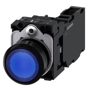 Leuchtdrucktaster, 22 mm, rund, Kunststoff, blau, Druckknopf, flach, tastend, mit Halter, 1S+1Ö, LED-Modul mit integrierter LED AC 230 V, Schraubanschluss Leuchtdrucktaster SIRIUS ACT zur Schaltung und Steuerung elektrischer Verbraucher. Unter dem Markennamen SIRIUS ACT bietet Siemens ein einzigartiges Portfolio an Befehls- und Meldegeräten mit weltweiten Produkt-Zulassungen in drei modernen Designreihen aus robustem Echtmetall und hochwertigem Kunststoff. Das innovative Aufschnappkonzept vereinfacht die Montage so weit, dass dafür nur eine Hand und kein Spezialwerkzeug erforderlich ist. Als Montagebohrungen genügen nutfreie Löcher, da bereits ein 100%iger Verdrehschutz integriert ist. Dank der durchgängig hohen Schutzart sind die robusten Geräte industrietauglich und für den Außeneinsatz geeignet. Sogar die Reinigung mit Hochdruckstrahl ist möglich. Weder Staub, Öle noch aggressive Laugen können den zuverlässigen Betrieb stören. Neben der Standardverdrahtung können die meisten Geräte auch über PROFINET, AS-Interface oder IO-Link an die Steuerung angebunden werden. Damit reduzieren Sie Ihren Verdrahtungsaufwand, minimieren Fehlerquellen und gewinnen mehr Flexibilität. Komfortabel unterstützt der grafische Online-Konfigurator bei Auswahl und Bestellung von Einzelgeräten, Gehäusen und Beschriftungen. Umfangreiche Dokumentation (z.B. Handbuch, 3D-Daten, Anschlussdiagramm) ist verfügbar. Lieferbare Ausführungen: mehrere Farben, beleuchtet/unbeleuchtet, mit/ohne Beschriftung, verrastende/tastende Betätigung, verschiedene Druckknopf- und Frontringhöhen. Hinweis: Komplettgerät, Lieferung inklusive Halter und Module. SIRIUS ACT - Performance in Action beim Befehlen und Melden. Einfach montiert, einfach stark, einfach perfekt.