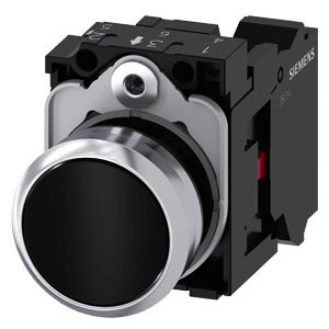 Drucktaster, 22 mm, rund, Metall, hochglanz, schwarz, Druckknopf, flach, tastend, 1Ö, Federzuganschluss Drucktaster SIRIUS ACT zur Schaltung und Steuerung elektrischer Verbraucher. Unter dem Markennamen SIRIUS ACT bietet Siemens ein einzigartiges Portfolio an Befehls- und Meldegeräten mit weltweiten Produkt-Zulassungen in drei modernen Designreihen aus robustem Echtmetall und hochwertigem Kunststoff. Das innovative Aufschnappkonzept vereinfacht die Montage so weit, dass dafür nur eine Hand und kein Spezialwerkzeug erforderlich ist. Als Montagebohrungen genügen nutfreie Löcher, da bereits ein 100%iger Verdrehschutz integriert ist. Dank der durchgängig hohen Schutzart sind die robusten Geräte industrietauglich und für den Außeneinsatz geeignet. Sogar die Reinigung mit Hochdruckstrahl ist möglich. Weder Staub, Öle noch aggressive Laugen können den zuverlässigen Betrieb stören. Neben der Standardverdrahtung können die meisten Geräte auch über PROFINET, AS-Interface oder IO-Link an die Steuerung angebunden werden. Damit reduzieren Sie Ihren Verdrahtungsaufwand, minimieren Fehlerquellen und gewinnen mehr Flexibilität. Komfortabel unterstützt der grafische Online-Konfigurator bei Auswahl und Bestellung von Einzelgeräten, Gehäusen und Beschriftungen. Umfangreiche Dokumentation (z.B. Handbuch, 3D-Daten, Anschlussdiagramm) ist verfügbar. Lieferbare Ausführungen: mehrere Farben, beleuchtet/unbeleuchtet, mit/ohne Beschriftung, verrastende/tastende Betätigung, verschiedene Druckknopf- und Frontringhöhen. Hinweis: Komplettgerät, Lieferung inklusive Halter und Module. SIRIUS ACT - Performance in Action beim Befehlen und Melden. Einfach montiert, einfach stark, einfach perfekt.