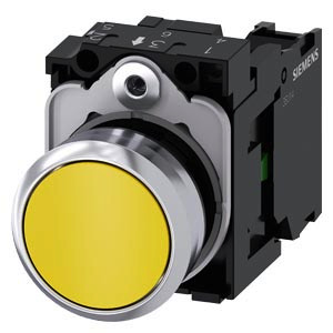 Drucktaster, 22 mm, rund, Metall, hochglanz, gelb, Druckknopf, flach, tastend, mit Halter, 1S, Schraubanschluss Drucktaster SIRIUS ACT zur Schaltung und Steuerung elektrischer Verbraucher. Unter dem Markennamen SIRIUS ACT bietet Siemens ein einzigartiges Portfolio an Befehls- und Meldegeräten mit weltweiten Produkt-Zulassungen in drei modernen Designreihen aus robustem Echtmetall und hochwertigem Kunststoff. Das innovative Aufschnappkonzept vereinfacht die Montage so weit, dass dafür nur eine Hand und kein Spezialwerkzeug erforderlich ist. Als Montagebohrungen genügen nutfreie Löcher, da bereits ein 100%iger Verdrehschutz integriert ist. Dank der durchgängig hohen Schutzart sind die robusten Geräte industrietauglich und für den Außeneinsatz geeignet. Sogar die Reinigung mit Hochdruckstrahl ist möglich. Weder Staub, Öle noch aggressive Laugen können den zuverlässigen Betrieb stören. Neben der Standardverdrahtung können die meisten Geräte auch über PROFINET, AS-Interface oder IO-Link an die Steuerung angebunden werden. Damit reduzieren Sie Ihren Verdrahtungsaufwand, minimieren Fehlerquellen und gewinnen mehr Flexibilität. Komfortabel unterstützt der grafische Online-Konfigurator bei Auswahl und Bestellung von Einzelgeräten, Gehäusen und Beschriftungen. Umfangreiche Dokumentation (z.B. Handbuch, 3D-Daten, Anschlussdiagramm) ist verfügbar. Lieferbare Ausführungen: mehrere Farben, beleuchtet/unbeleuchtet, mit/ohne Beschriftung, verrastende/tastende Betätigung, verschiedene Druckknopf- und Frontringhöhen. Hinweis: Komplettgerät, Lieferung inklusive Halter und Module. SIRIUS ACT - Performance in Action beim Befehlen und Melden. Einfach montiert, einfach stark, einfach perfekt.