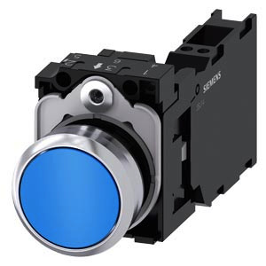 Drucktaster, 22 mm, rund, Metall, hochglanz, blau, Druckknopf, flach, tastend, 1S+1Ö, Federzuganschluss Drucktaster SIRIUS ACT zur Schaltung und Steuerung elektrischer Verbraucher. Unter dem Markennamen SIRIUS ACT bietet Siemens ein einzigartiges Portfolio an Befehls- und Meldegeräten mit weltweiten Produkt-Zulassungen in drei modernen Designreihen aus robustem Echtmetall und hochwertigem Kunststoff. Das innovative Aufschnappkonzept vereinfacht die Montage so weit, dass dafür nur eine Hand und kein Spezialwerkzeug erforderlich ist. Als Montagebohrungen genügen nutfreie Löcher, da bereits ein 100%iger Verdrehschutz integriert ist. Dank der durchgängig hohen Schutzart sind die robusten Geräte industrietauglich und für den Außeneinsatz geeignet. Sogar die Reinigung mit Hochdruckstrahl ist möglich. Weder Staub, Öle noch aggressive Laugen können den zuverlässigen Betrieb stören. Neben der Standardverdrahtung können die meisten Geräte auch über PROFINET, AS-Interface oder IO-Link an die Steuerung angebunden werden. Damit reduzieren Sie Ihren Verdrahtungsaufwand, minimieren Fehlerquellen und gewinnen mehr Flexibilität. Komfortabel unterstützt der grafische Online-Konfigurator bei Auswahl und Bestellung von Einzelgeräten, Gehäusen und Beschriftungen. Umfangreiche Dokumentation (z.B. Handbuch, 3D-Daten, Anschlussdiagramm) ist verfügbar. Lieferbare Ausführungen: mehrere Farben, beleuchtet/unbeleuchtet, mit/ohne Beschriftung, verrastende/tastende Betätigung, verschiedene Druckknopf- und Frontringhöhen. Hinweis: Komplettgerät, Lieferung inklusive Halter und Module. SIRIUS ACT - Performance in Action beim Befehlen und Melden. Einfach montiert, einfach stark, einfach perfekt.