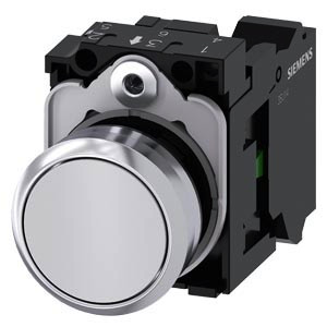 Drucktaster, 22 mm, rund, Metall, hochglanz, weiß, Druckknopf, flach, tastend, mit Halter, 1S, Federzuganschluss Drucktaster SIRIUS ACT zur Schaltung und Steuerung elektrischer Verbraucher. Unter dem Markennamen SIRIUS ACT bietet Siemens ein einzigartiges Portfolio an Befehls- und Meldegeräten mit weltweiten Produkt-Zulassungen in drei modernen Designreihen aus robustem Echtmetall und hochwertigem Kunststoff. Das innovative Aufschnappkonzept vereinfacht die Montage so weit, dass dafür nur eine Hand und kein Spezialwerkzeug erforderlich ist. Als Montagebohrungen genügen nutfreie Löcher, da bereits ein 100%iger Verdrehschutz integriert ist. Dank der durchgängig hohen Schutzart sind die robusten Geräte industrietauglich und für den Außeneinsatz geeignet. Sogar die Reinigung mit Hochdruckstrahl ist möglich. Weder Staub, Öle noch aggressive Laugen können den zuverlässigen Betrieb stören. Neben der Standardverdrahtung können die meisten Geräte auch über PROFINET, AS-Interface oder IO-Link an die Steuerung angebunden werden. Damit reduzieren Sie Ihren Verdrahtungsaufwand, minimieren Fehlerquellen und gewinnen mehr Flexibilität. Komfortabel unterstützt der grafische Online-Konfigurator bei Auswahl und Bestellung von Einzelgeräten, Gehäusen und Beschriftungen. Umfangreiche Dokumentation (z.B. Handbuch, 3D-Daten, Anschlussdiagramm) ist verfügbar. Lieferbare Ausführungen: mehrere Farben, beleuchtet/unbeleuchtet, mit/ohne Beschriftung, verrastende/tastende Betätigung, verschiedene Druckknopf- und Frontringhöhen. Hinweis: Komplettgerät, Lieferung inklusive Halter und Module. SIRIUS ACT - Performance in Action beim Befehlen und Melden. Einfach montiert, einfach stark, einfach perfekt.