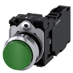 Drucktaster, 22 mm, rund, Metall, hochglanz, grün, Druckknopf, hoch, tastend, mit Halter, 1S+1Ö, Schraubanschluss Drucktaster SIRIUS ACT zur Schaltung und Steuerung elektrischer Verbraucher. Unter dem Markennamen SIRIUS ACT bietet Siemens ein einzigartiges Portfolio an Befehls- und Meldegeräten mit weltweiten Produkt-Zulassungen in drei modernen Designreihen aus robustem Echtmetall und hochwertigem Kunststoff. Das innovative Aufschnappkonzept vereinfacht die Montage so weit, dass dafür nur eine Hand und kein Spezialwerkzeug erforderlich ist. Als Montagebohrungen genügen nutfreie Löcher, da bereits ein 100%iger Verdrehschutz integriert ist. Dank der durchgängig hohen Schutzart sind die robusten Geräte industrietauglich und für den Außeneinsatz geeignet. Sogar die Reinigung mit Hochdruckstrahl ist möglich. Weder Staub, Öle noch aggressive Laugen können den zuverlässigen Betrieb stören. Neben der Standardverdrahtung können die meisten Geräte auch über PROFINET, AS-Interface oder IO-Link an die Steuerung angebunden werden. Damit reduzieren Sie Ihren Verdrahtungsaufwand, minimieren Fehlerquellen und gewinnen mehr Flexibilität. Komfortabel unterstützt der grafische Online-Konfigurator bei Auswahl und Bestellung von Einzelgeräten, Gehäusen und Beschriftungen. Umfangreiche Dokumentation (z.B. Handbuch, 3D-Daten, Anschlussdiagramm) ist verfügbar. Lieferbare Ausführungen: mehrere Farben, beleuchtet/unbeleuchtet, mit/ohne Beschriftung, verrastende/tastende Betätigung, verschiedene Druckknopf- und Frontringhöhen. Hinweis: Komplettgerät, Lieferung inklusive Halter und Module. SIRIUS ACT - Performance in Action beim Befehlen und Melden. Einfach montiert, einfach stark, einfach perfekt.