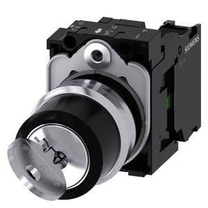 Schlüsselschalter, Kunststoff, RONIS, 2 Stellungen, verrastend, 90° Schlüsselschalter RONIS, 22 mm, rund, Metall, hochglanz, Schließ-Nr. SB30, mit 2 Schlüsseln, 2 Schaltstellungen O-I, verrastend, Schaltwinkel 90°, 10:30h/13:30h, Schlüsselabzug O+I, mit Halter, 1S, Schraubanschluss, mögliche Sonderschließungen: SB31, 421, 455 Schlüsselschalter SIRIUS ACT für einen höheren Anspruch an Zugangssicherheit. Unter dem Markennamen SIRIUS ACT bietet Siemens ein einzigartiges Portfolio an Befehls- und Meldegeräten mit weltweiten Produkt-Zulassungen in drei modernen Designreihen aus robustem Echtmetall und hochwertigem Kunststoff. Das innovative Aufschnappkonzept vereinfacht die Montage so weit, dass dafür nur eine Hand und kein Spezialwerkzeug erforderlich ist. Als Montagebohrungen genügen nutfreie Löcher, da bereits ein 100%iger Verdrehschutz integriert ist. Dank der durchgängig hohen Schutzart sind die robusten Geräte industrietauglich und für den Außeneinsatz geeignet. Sogar die Reinigung mit Hochdruckstrahl ist möglich. Weder Staub, Öle noch aggressive Laugen können den zuverlässigen Betrieb stören. Neben der Standardverdrahtung können die meisten Geräte auch über PROFINET, AS-Interface oder IO-Link an die Steuerung angebunden werden. Damit reduzieren Sie Ihren Verdrahtungsaufwand, minimieren Fehlerquellen und gewinnen mehr Flexibilität. Komfortabel unterstützt der grafische Online-Konfigurator bei Auswahl und Bestellung von Einzelgeräten, Gehäusen und Beschriftungen. Umfangreiche Dokumentation (z.B. Handbuch, 3D-Daten, Anschlussdiagramm) ist verfügbar. Lieferbare Ausführungen: verschiedene Schließsysteme (Siemens, C, Siemens, B, RONIS, OMR), 2/3 Schaltstellungen, verrastende/tastende Betätigung, verschiedene Schlüsselabzugstellungen. Hinweis: Komplettgerät, Lieferung inklusive Halter und Module. SIRIUS ACT - Performance in Action beim Befehlen und Melden. Einfach montiert, einfach stark, einfach perfekt.