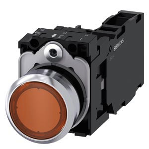 Leuchtdrucktaster, 22 mm, rund, Metall, hochglanz, amber, Druckknopf, flach, tastend, mit Halter, 1S+1Ö, LED-Modul mit integrierter LED AC/DC 24V, Schraubanschluss Leuchtdrucktaster SIRIUS ACT zur Schaltung und Steuerung elektrischer Verbraucher. Unter dem Markennamen SIRIUS ACT bietet Siemens ein einzigartiges Portfolio an Befehls- und Meldegeräten mit weltweiten Produkt-Zulassungen in drei modernen Designreihen aus robustem Echtmetall und hochwertigem Kunststoff. Das innovative Aufschnappkonzept vereinfacht die Montage so weit, dass dafür nur eine Hand und kein Spezialwerkzeug erforderlich ist. Als Montagebohrungen genügen nutfreie Löcher, da bereits ein 100%iger Verdrehschutz integriert ist. Dank der durchgängig hohen Schutzart sind die robusten Geräte industrietauglich und für den Außeneinsatz geeignet. Sogar die Reinigung mit Hochdruckstrahl ist möglich. Weder Staub, Öle noch aggressive Laugen können den zuverlässigen Betrieb stören. Neben der Standardverdrahtung können die meisten Geräte auch über PROFINET, AS-Interface oder IO-Link an die Steuerung angebunden werden. Damit reduzieren Sie Ihren Verdrahtungsaufwand, minimieren Fehlerquellen und gewinnen mehr Flexibilität. Komfortabel unterstützt der grafische Online-Konfigurator bei Auswahl und Bestellung von Einzelgeräten, Gehäusen und Beschriftungen. Umfangreiche Dokumentation (z.B. Handbuch, 3D-Daten, Anschlussdiagramm) ist verfügbar. Lieferbare Ausführungen: mehrere Farben, beleuchtet/unbeleuchtet, mit/ohne Beschriftung, verrastende/tastende Betätigung, verschiedene Druckknopf- und Frontringhöhen. Hinweis: Komplettgerät, Lieferung inklusive Halter und Module. SIRIUS ACT - Performance in Action beim Befehlen und Melden. Einfach montiert, einfach stark, einfach perfekt.