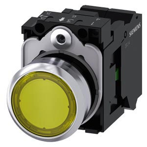 Leuchtdrucktaster, 22 mm, rund, Metall, hochglanz, gelb, Druckknopf, flach, tastend, mit Halter, 1S, LED-Modul mit integrierter LED AC/DC 24V, Federzuganschluss Leuchtdrucktaster SIRIUS ACT zur Schaltung und Steuerung elektrischer Verbraucher. Unter dem Markennamen SIRIUS ACT bietet Siemens ein einzigartiges Portfolio an Befehls- und Meldegeräten mit weltweiten Produkt-Zulassungen in drei modernen Designreihen aus robustem Echtmetall und hochwertigem Kunststoff. Das innovative Aufschnappkonzept vereinfacht die Montage so weit, dass dafür nur eine Hand und kein Spezialwerkzeug erforderlich ist. Als Montagebohrungen genügen nutfreie Löcher, da bereits ein 100%iger Verdrehschutz integriert ist. Dank der durchgängig hohen Schutzart sind die robusten Geräte industrietauglich und für den Außeneinsatz geeignet. Sogar die Reinigung mit Hochdruckstrahl ist möglich. Weder Staub, Öle noch aggressive Laugen können den zuverlässigen Betrieb stören. Neben der Standardverdrahtung können die meisten Geräte auch über PROFINET, AS-Interface oder IO-Link an die Steuerung angebunden werden. Damit reduzieren Sie Ihren Verdrahtungsaufwand, minimieren Fehlerquellen und gewinnen mehr Flexibilität. Komfortabel unterstützt der grafische Online-Konfigurator bei Auswahl und Bestellung von Einzelgeräten, Gehäusen und Beschriftungen. Umfangreiche Dokumentation (z.B. Handbuch, 3D-Daten, Anschlussdiagramm) ist verfügbar. Lieferbare Ausführungen: mehrere Farben, beleuchtet/unbeleuchtet, mit/ohne Beschriftung, verrastende/tastende Betätigung, verschiedene Druckknopf- und Frontringhöhen. Hinweis: Komplettgerät, Lieferung inklusive Halter und Module. SIRIUS ACT - Performance in Action beim Befehlen und Melden. Einfach montiert, einfach stark, einfach perfekt.