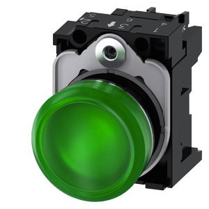 Leuchtmelder, 22 mm, rund, Metall, hochglanz, grün, Linse, glatt, mit Halter, LED-Modul mit integrierter LED AC/DC 24V, Schraubanschluss Leuchtmelder SIRIUS ACT zur Signalisierung von Schaltzuständen oder Störungen in Anlagen mit brillianter Leuchtkraft dank energieeffizienter LED-Technologie. Unter dem Markennamen SIRIUS ACT bietet Siemens ein einzigartiges Portfolio an Befehls- und Meldegeräten mit weltweiten Produkt-Zulassungen in drei modernen Designreihen aus robustem Echtmetall und hochwertigem Kunststoff. Das innovative Aufschnappkonzept vereinfacht die Montage so weit, dass dafür nur eine Hand und kein Spezialwerkzeug erforderlich ist. Als Montagebohrungen genügen nutfreie Löcher, da bereits ein 100%iger Verdrehschutz integriert ist. Dank der durchgängig hohen Schutzart sind die robusten Geräte industrietauglich und für den Außeneinsatz geeignet. Sogar die Reinigung mit Hochdruckstrahl ist möglich. Weder Staub, Öle noch aggressive Laugen können den zuverlässigen Betrieb stören. Neben der Standardverdrahtung können die meisten Geräte auch über PROFINET, AS-Interface oder IO-Link an die Steuerung angebunden werden. Damit reduzieren Sie Ihren Verdrahtungsaufwand, minimieren Fehlerquellen und gewinnen mehr Flexibilität. Komfortabel unterstützt der grafische Online-Konfigurator bei Auswahl und Bestellung von Einzelgeräten, Gehäusen und Beschriftungen. Umfangreiche Dokumentation (z.B. Handbuch, 3D-Daten, Anschlussdiagramm) ist verfügbar. Lieferbare Ausführungen: mehrere Farben, verschiedene Spannungsvarianten. Hinweis: Komplettgerät, Lieferung inklusive Halter und Module. SIRIUS ACT - Performance in Action beim Befehlen und Melden. Einfach montiert, einfach stark, einfach perfekt.