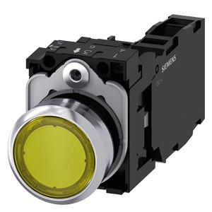 Leuchtdrucktaster, 22 mm, rund, Metall, hochglanz, gelb, Druckknopf, flach, tastend, mit Halter, 1S+1Ö, LED-Modul mit integrierter LED AC 110 V, Schraubanschluss Leuchtdrucktaster SIRIUS ACT zur Schaltung und Steuerung elektrischer Verbraucher. Unter dem Markennamen SIRIUS ACT bietet Siemens ein einzigartiges Portfolio an Befehls- und Meldegeräten mit weltweiten Produkt-Zulassungen in drei modernen Designreihen aus robustem Echtmetall und hochwertigem Kunststoff. Das innovative Aufschnappkonzept vereinfacht die Montage so weit, dass dafür nur eine Hand und kein Spezialwerkzeug erforderlich ist. Als Montagebohrungen genügen nutfreie Löcher, da bereits ein 100%iger Verdrehschutz integriert ist. Dank der durchgängig hohen Schutzart sind die robusten Geräte industrietauglich und für den Außeneinsatz geeignet. Sogar die Reinigung mit Hochdruckstrahl ist möglich. Weder Staub, Öle noch aggressive Laugen können den zuverlässigen Betrieb stören. Neben der Standardverdrahtung können die meisten Geräte auch über PROFINET, AS-Interface oder IO-Link an die Steuerung angebunden werden. Damit reduzieren Sie Ihren Verdrahtungsaufwand, minimieren Fehlerquellen und gewinnen mehr Flexibilität. Komfortabel unterstützt der grafische Online-Konfigurator bei Auswahl und Bestellung von Einzelgeräten, Gehäusen und Beschriftungen. Umfangreiche Dokumentation (z.B. Handbuch, 3D-Daten, Anschlussdiagramm) ist verfügbar. Lieferbare Ausführungen: mehrere Farben, beleuchtet/unbeleuchtet, mit/ohne Beschriftung, verrastende/tastende Betätigung, verschiedene Druckknopf- und Frontringhöhen. Hinweis: Komplettgerät, Lieferung inklusive Halter und Module. SIRIUS ACT - Performance in Action beim Befehlen und Melden. Einfach montiert, einfach stark, einfach perfekt.