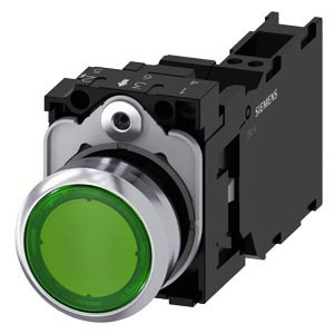 Leuchtdrucktaster, 22 mm, rund, Metall, hochglanz, grün, Druckknopf, flach, tastend, mit Halter, 1S+1Ö, LED-Modul mit integrierter LED AC 110 V, Federzuganschluss Leuchtdrucktaster SIRIUS ACT zur Schaltung und Steuerung elektrischer Verbraucher. Unter dem Markennamen SIRIUS ACT bietet Siemens ein einzigartiges Portfolio an Befehls- und Meldegeräten mit weltweiten Produkt-Zulassungen in drei modernen Designreihen aus robustem Echtmetall und hochwertigem Kunststoff. Das innovative Aufschnappkonzept vereinfacht die Montage so weit, dass dafür nur eine Hand und kein Spezialwerkzeug erforderlich ist. Als Montagebohrungen genügen nutfreie Löcher, da bereits ein 100%iger Verdrehschutz integriert ist. Dank der durchgängig hohen Schutzart sind die robusten Geräte industrietauglich und für den Außeneinsatz geeignet. Sogar die Reinigung mit Hochdruckstrahl ist möglich. Weder Staub, Öle noch aggressive Laugen können den zuverlässigen Betrieb stören. Neben der Standardverdrahtung können die meisten Geräte auch über PROFINET, AS-Interface oder IO-Link an die Steuerung angebunden werden. Damit reduzieren Sie Ihren Verdrahtungsaufwand, minimieren Fehlerquellen und gewinnen mehr Flexibilität. Komfortabel unterstützt der grafische Online-Konfigurator bei Auswahl und Bestellung von Einzelgeräten, Gehäusen und Beschriftungen. Umfangreiche Dokumentation (z.B. Handbuch, 3D-Daten, Anschlussdiagramm) ist verfügbar. Lieferbare Ausführungen: mehrere Farben, beleuchtet/unbeleuchtet, mit/ohne Beschriftung, verrastende/tastende Betätigung, verschiedene Druckknopf- und Frontringhöhen. Hinweis: Komplettgerät, Lieferung inklusive Halter und Module. SIRIUS ACT - Performance in Action beim Befehlen und Melden. Einfach montiert, einfach stark, einfach perfekt.