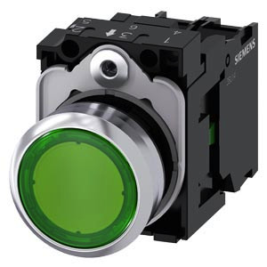 Leuchtdrucktaster, 22 mm, rund, Metall, hochglanz, grün, Druckknopf, flach, tastend, mit Halter, 1S, LED-Modul mit integrierter LED AC 230 V, Schraubanschluss Leuchtdrucktaster SIRIUS ACT zur Schaltung und Steuerung elektrischer Verbraucher. Unter dem Markennamen SIRIUS ACT bietet Siemens ein einzigartiges Portfolio an Befehls- und Meldegeräten mit weltweiten Produkt-Zulassungen in drei modernen Designreihen aus robustem Echtmetall und hochwertigem Kunststoff. Das innovative Aufschnappkonzept vereinfacht die Montage so weit, dass dafür nur eine Hand und kein Spezialwerkzeug erforderlich ist. Als Montagebohrungen genügen nutfreie Löcher, da bereits ein 100%iger Verdrehschutz integriert ist. Dank der durchgängig hohen Schutzart sind die robusten Geräte industrietauglich und für den Außeneinsatz geeignet. Sogar die Reinigung mit Hochdruckstrahl ist möglich. Weder Staub, Öle noch aggressive Laugen können den zuverlässigen Betrieb stören. Neben der Standardverdrahtung können die meisten Geräte auch über PROFINET, AS-Interface oder IO-Link an die Steuerung angebunden werden. Damit reduzieren Sie Ihren Verdrahtungsaufwand, minimieren Fehlerquellen und gewinnen mehr Flexibilität. Komfortabel unterstützt der grafische Online-Konfigurator bei Auswahl und Bestellung von Einzelgeräten, Gehäusen und Beschriftungen. Umfangreiche Dokumentation (z.B. Handbuch, 3D-Daten, Anschlussdiagramm) ist verfügbar. Lieferbare Ausführungen: mehrere Farben, beleuchtet/unbeleuchtet, mit/ohne Beschriftung, verrastende/tastende Betätigung, verschiedene Druckknopf- und Frontringhöhen. Hinweis: Komplettgerät, Lieferung inklusive Halter und Module. SIRIUS ACT - Performance in Action beim Befehlen und Melden. Einfach montiert, einfach stark, einfach perfekt.