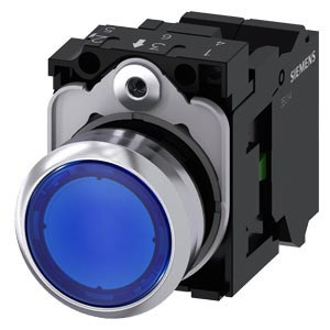 Leuchtdrucktaster, 22 mm, rund, Metall, hochglanz, blau, Druckknopf, flach, tastend, mit Halter, 1S, LED-Modul mit integrierter LED AC 230 V, Federzuganschluss Leuchtdrucktaster SIRIUS ACT zur Schaltung und Steuerung elektrischer Verbraucher. Unter dem Markennamen SIRIUS ACT bietet Siemens ein einzigartiges Portfolio an Befehls- und Meldegeräten mit weltweiten Produkt-Zulassungen in drei modernen Designreihen aus robustem Echtmetall und hochwertigem Kunststoff. Das innovative Aufschnappkonzept vereinfacht die Montage so weit, dass dafür nur eine Hand und kein Spezialwerkzeug erforderlich ist. Als Montagebohrungen genügen nutfreie Löcher, da bereits ein 100%iger Verdrehschutz integriert ist. Dank der durchgängig hohen Schutzart sind die robusten Geräte industrietauglich und für den Außeneinsatz geeignet. Sogar die Reinigung mit Hochdruckstrahl ist möglich. Weder Staub, Öle noch aggressive Laugen können den zuverlässigen Betrieb stören. Neben der Standardverdrahtung können die meisten Geräte auch über PROFINET, AS-Interface oder IO-Link an die Steuerung angebunden werden. Damit reduzieren Sie Ihren Verdrahtungsaufwand, minimieren Fehlerquellen und gewinnen mehr Flexibilität. Komfortabel unterstützt der grafische Online-Konfigurator bei Auswahl und Bestellung von Einzelgeräten, Gehäusen und Beschriftungen. Umfangreiche Dokumentation (z.B. Handbuch, 3D-Daten, Anschlussdiagramm) ist verfügbar. Lieferbare Ausführungen: mehrere Farben, beleuchtet/unbeleuchtet, mit/ohne Beschriftung, verrastende/tastende Betätigung, verschiedene Druckknopf- und Frontringhöhen. Hinweis: Komplettgerät, Lieferung inklusive Halter und Module. SIRIUS ACT - Performance in Action beim Befehlen und Melden. Einfach montiert, einfach stark, einfach perfekt.