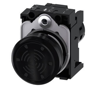 Akustischer Melder, kompakt, 22 mm, rund, Kunststoff, schwarz, Dauerton 4,5 kHz, IP69, Schalldruck 75+/-10% dB/10 cm, mit Halter, Betriebsspannung AC/DC 24 V, Schraubanschluss Akustischer Melder SIRIUS ACT zur Signalisierung von Zuständen durch Dauerton. Unter dem Markennamen SIRIUS ACT bietet Siemens ein einzigartiges Portfolio an Befehls- und Meldegeräten mit weltweiten Produkt-Zulassungen in drei modernen Designreihen aus robustem Echtmetall und hochwertigem Kunststoff. Das innovative Aufschnappkonzept vereinfacht die Montage so weit, dass dafür nur eine Hand und kein Spezialwerkzeug erforderlich ist. Als Montagebohrungen genügen nutfreie Löcher, da bereits ein 100%iger Verdrehschutz integriert ist. Dank der durchgängig hohen Schutzart sind die robusten Geräte industrietauglich und für den Außeneinsatz geeignet. Sogar die Reinigung mit Hochdruckstrahl ist möglich. Weder Staub, Öle noch aggressive Laugen können den zuverlässigen Betrieb stören. Neben der Standardverdrahtung können die meisten Geräte auch über PROFINET, AS-Interface oder IO-Link an die Steuerung angebunden werden. Damit reduzieren Sie Ihren Verdrahtungsaufwand, minimieren Fehlerquellen und gewinnen mehr Flexibilität. Komfortabel unterstützt der grafische Online-Konfigurator bei Auswahl und Bestellung von Einzelgeräten, Gehäusen und Beschriftungen. Umfangreiche Dokumentation (z.B. Handbuch, 3D-Daten, Anschlussdiagramm) ist verfügbar. Lieferbare Ausführungen: verschiedene Spannungsvarianten. Hinweis: Kompaktgerät mit integrierter elektrischer Funktion. Lieferung inklusive Halter. SIRIUS ACT - Performance in Action beim Befehlen und Melden. Einfach montiert, einfach stark, einfach perfekt.
