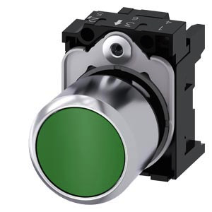 Drucktaster, kompakt, mit verlängertem Hub (12 mm), 22 mm, rund, Metall, grün, Druckknopf, flach, tastend, mit Halter Drucktaster SIRIUS ACT zur Schaltung und Steuerung elektrischer Verbraucher. Unter dem Markennamen SIRIUS ACT bietet Siemens ein einzigartiges Portfolio an Befehls- und Meldegeräten mit weltweiten Produkt-Zulassungen in drei modernen Designreihen aus robustem Echtmetall und hochwertigem Kunststoff. Das innovative Aufschnappkonzept vereinfacht die Montage so weit, dass dafür nur eine Hand und kein Spezialwerkzeug erforderlich ist. Als Montagebohrungen genügen nutfreie Löcher, da bereits ein 100%iger Verdrehschutz integriert ist. Dank der durchgängig hohen Schutzart sind die robusten Geräte industrietauglich und für den Außeneinsatz geeignet. Sogar die Reinigung mit Hochdruckstrahl ist möglich. Weder Staub, Öle noch aggressive Laugen können den zuverlässigen Betrieb stören. Neben der Standardverdrahtung können die meisten Geräte auch über PROFINET, AS-Interface oder IO-Link an die Steuerung angebunden werden. Damit reduzieren Sie Ihren Verdrahtungsaufwand, minimieren Fehlerquellen und gewinnen mehr Flexibilität. Komfortabel unterstützt der grafische Online-Konfigurator bei Auswahl und Bestellung von Einzelgeräten, Gehäusen und Beschriftungen. Umfangreiche Dokumentation (z.B. Handbuch, 3D-Daten, Anschlussdiagramm) ist verfügbar. Lieferbare Ausführungen: mehrere Farben, beleuchtet/unbeleuchtet, mit/ohne Beschriftung, verrastende/tastende Betätigung, verschiedene Druckknopf- und Frontringhöhen. Hinweis: Kompaktgerät mit mechanischer Schaltfunktion, kann nur mit Verlängerungsstößel (3SU1900-0KG10-0AA0) eingesetzt werden. Lieferung inklusive Halter. SIRIUS ACT - Performance in Action beim Befehlen und Melden. Einfach montiert, einfach stark, einfach perfekt.