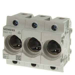 NEOZED, Sicherungssockel, D02, 3-polig, 63 A, Un AC: 400 V, Un DC: 250 V ohne LED-Signalmelder mit Rahmenklemme NEOZED-Sicherungssockel 5SG1, 5SG5 aus Duroplast/ Formstoff. Das NEOZED-Sicherungssystem von Siemens als wichtiger Bestandteil der SENTRON Schutzkomponenten für die Elektroinstallation bietet effektiven Personen-, Geräte- und Anlagenschutz durch sicheres Abschalten im Überlast- und Kurzschlussfall. Es wird vorwiegend in der Verteilertechnik und in industriellen Schaltanlagen eingesetzt. Das System ist laienbedienbar und auch für die Hausinstallation zugelassen. Die Siemens NEOZED-Sicherungssockel 5SG1, 5SG5 zeichnen sich vor allem aus durch: 1. Personensicherheit durch berührungsgeschützte Klemmen am Zu- und Abgang. 2. Doppelte Klemmkammern beim Komfortsockel ermöglichen den Anschluss von zwei Leitern unterschiedlichen Querschnitts. 3. Deutlich kompaktere Bauweise im Vergleich zu DIAZED und dadurch Platzersparnis im Verteiler. 4. NEOZED-Sicherungssockel aus Formstoff. 5. Sichtbarer, eindeutiger und kontrollierbarer Anschluss der Leiter. Das erleichtert die Leitungseinführung und spart Arbeitszeit. 6. Zwei Typenreihen mit unterschiedlichen Anschlussklemmen erhöhen die Möglichkeiten in der Anwendung.