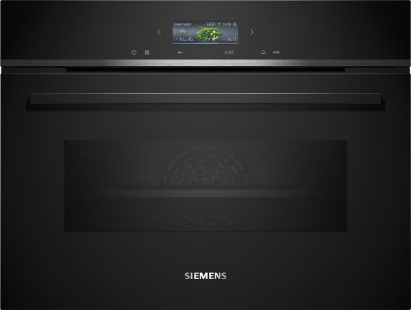 Backofentyp und Heizart Kompaktbackofen mit Mikrowelle mit 16 Beheizungsarten: Ober-/Unterhitze, Umluftgrill, Großflächengrill, Kleinflächengrill, separate Unterhitze, Vorwärmen von Geschirr, Ober-/Unterhitze sanft, 2D Heißluft, Air Fry, Mikrowelle, Umluft + Mikrowelle, Ober-/Unterhitze + Mikrowelle, Großflächengrill + Mikrowelle, Kleinflächengrill + Mikrowelle, Umluftgrillen + Mikrowelle Zusätzliche Heizarten über die Home Connect App: Ruhen lassen, Vorwärmen Max. Power: 900 W; 5 Mikrowellen-Leistungsstufen (90 W,180 W,360 W,600 W, boost) mit Inverter (MW) Intelligente Inverter-Technologie: die Maximal-Leistung wird bei längerem Betrieb bis auf 600 W reguliert Temperaturregelung von 30 °C - 230 °C Garraumvolumen: 45 l Zubehörträger / Auszugssystem: Einschubebenen: 3 Design touchControl-Bedienung Garraum: Email anthrazit Reinigung humidClean (Reinigungshilfe): Leichte Verschmutzungen entfernen mit Wasserdampf und Spülmittel. Komfort Backofenassistent mit Sprachsteuerung (über Amazon Alexa) TFT-Full-Touchdisplay Elektronik-Uhr Optische Aufheizkontrolle Temperaturvorschlag Ist-Temperaturanzeige Klapptür softMove: Sanftes Öffnen und Schließen der Backofentür. cookControl Pro: In der Gerichte-Funktion stehen mehrere Zubereitungsmöglichkeiten zur Auswahl Backofenbeleuchtung abschaltbar, LED-Innenbeleuchtung Kühlgebläse Home Connect Zubehör Kombirost 1 x Universalpfanne Umwelt und Sicherheit Sehr geringe Fenstertemperatur 3-fache Türverglasung Kindersicherung Sicherheitsabschaltung Restwärmeanzeige Starttaste Türkontaktschalter Technische Info Länge des Anschlusskabels: 150 cm Nennspannung: 220 - 240 V Gesamtanschlusswert Elektro: 3.6 kW Maße Gerätemaße (HxBxT): 455 x 594 x 548mm Nischenmaße (HxBxT): 455 mm x 560 mm x 550 mm „Maße und Einbauhinweise zu diesem Gerät gemäß technischer Zeichnung beachten“ Um die technische und optische Kompatibilität zu gewährleisten, empfehlen wir Ihnen, Komplementär-Produkte innerhalb der Produktserie IQ700 zu wählen, um die bestmögliche Einbausituation Ihrer Einbaugeräte zu gewährleisten.