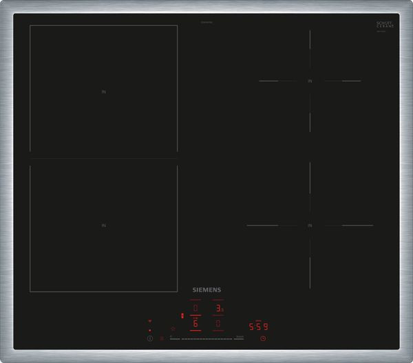 60 cm: Platz für 4 Töpfe oder Pfannen Flexibilität der Kochzonen Kombi-Induktion: Bei Verwendung von größerem Kochgeschirr werden zwei Kochzonen zu einer größeren verbunden. Kochzone vorne links: 190 mm, 210 mm, 2.5 kW (maximale Leistung 3.7 kW) Kochzone hinten links: 190 mm, 210 mm, 2.5 kW (maximale Leistung 3.7 kW) Kochzone hinten rechts: 145 mm, 1.6 kW (maximale Leistung 2.2 kW) Kochzone vorne rechts: 180 mm, 2 kW (maximale Leistung 3.1 kW) Benutzerfreundlichkeit touchSlider: Steuern Sie die Leistung direkt mit der aufgedruckten Touch-Leiste. Favoriten-Taste: Mit einer konfigurierbaren Taste direkt auf Lieblingsfunktionen zugreifen. 17 Leistungsstufen: Stelle die Hitze mit 17 Leistungsstufen (9 Hauptstufen und 8 Zwischenstufen) präzise ein. Warmhalte-Funktion, wählbar über Favoriten-Taste/Home Connect App (für Geräte, die mit dem Home Connect-Konto verbunden sind): Warmhalten von Speisen bei voreingestellter niedriger Leistungsstufe. Timer mit Abschaltfunktion: Schaltet die Kochzone am Ende der eingestellten Zeit aus (z. B. für gekochte Eier). Timerfunktion (kann anstelle des Abschalttimers ausgewählt werden): Ein Signal ertönt am Ende der eingestellten Zeit (z. B. beim Pastakochen). Die Lautstärke der Signaltöne kann an die persönlichen Vorlieben und Bedürfnisse angepasst werden. Zeitersparnis und Effizienz powerBoost-Funktion für alle Kochzonen: Mit 50 % mehr Leistung z. B. Wasser schneller zum Kochen bringen als auf höchster Leistungsstufe. powerBoost-Funktion für Pfannen, wählbar über Favoriten-Taste/Home Connect App (für Geräte, die mit dem Home Connect-Konto verbunden sind): Erhitzt Pfannen schneller als auf höchster normaler Leistungsstufe und schützt gleichzeitig die Pfannenbeschichtung. quickStart: Beim Einschalten wählt das Kochfeld automatisch die Kochzone aus, auf dem im ausgeschalteten Zustand Kochgeschirr platziert wurde. reStart: Im Falle von unbeabsichtigtem Ausschalten des Kochfeldes bleiben alle Einstellungen erhalten, wenn du innerhalb von 4 Sekunden wieder einschaltest. Konnektivität Home Connect Funktion (WLAN): Überprüfe, ob das Kochfeld auch dann ausgeschaltet ist, wenn du nicht zu Hause bist und suche in der Home Connect-App nach Rezepten oder zusätzlichen Funktionen. cookConnect System (mit passendem Dunstabzug): Aktiviert den Dunstabzug beim Kochen automatisch, dank der WiFi-Verbindung von Kochfeld und Home Connect Dunstabzug (verbunden mit einem Home-Connect-Konto). Intelligente Dunstabzugsautomatik: Der Dunstabzug passt die Leistungsstufe automatisch an, da das Kochfeld kontinuierlich Kochdaten liefert (mit passendem Dunstabzug und verbundenem Home Connect-Konto). Smart Home Trigger (verfügbar mit verbundenem Home Connect-Konto): Öffnen Sie mit der Favoriten-Taste das intelligente Universum Ihres Kochfelds und steuern Sie andere Smart Home Geräte aus Ihrem Haushalt (Partnerservice erforderlich). Aktualisierbares Gerät (verfügbar mit verbundenem Home Connect-Konto): Halten Sie das Gerät immer auf dem neuesten Stand der Software. Design Rahmen: Flachrahmen-Design Sicherheit 2-stufige Restwärmeanzeige je Kochzone: Zeigt an, welche Kochzonen noch heiß oder warm sind. Kindersicherung: Verhindert eine unbeabsichtigte Aktivierung des Kochfeldes. Pause-Funktion: Unterbrechen Sie das Kochen, z. B. um die Haustür zu öffnen. Hauptschalter: Alle Kochzonen auf einmal ausschalten. Automatische Sicherheitsabschaltung: Aus Sicherheitsgründen schaltet sich das Kochfeld nach einer voreingestellten Zeit ohne Interaktion automatisch ab. Installation Maße des Gerätes (HxBxT mm): 55 x 583 x 513 Erforderliche Nischenmaße (HxBxT mm): 55 x 560 x (490 - 500) Minimale Arbeitsplattenstärke: 16 mm Gesamtanschlusswert: 6900 W powerManagement Funktion: Bei Bedarf die maximale Leistung begrenzen (abhängig von der Absicherung der Elektroinstallation).
