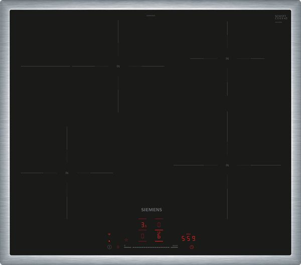 60 cm: Platz für 4 Töpfe oder Pfannen Flexibilität der Kochzonen Bräterzone: Extra zuschaltbare Kochzone für großes Bratgeschirr Kochzone vorne links: 180 mm, 2 kW (maximale Leistung 3.1 kW) Kochzone hinten links: 180 mm, 280 mm, 2 kW (maximale Leistung 3.1 kW) Kochzone hinten rechts: 145 mm, 1.6 kW (maximale Leistung 2.2 kW) Kochzone vorne rechts: 210 mm, 2.5 kW (maximale Leistung 3.7 kW) Benutzerfreundlichkeit touchSlider: Steuern Sie die Leistung direkt mit der aufgedruckten Touch-Leiste. Favoriten-Taste: Mit einer konfigurierbaren Taste direkt auf Lieblingsfunktionen zugreifen. 17 Leistungsstufen: Stelle die Hitze mit 17 Leistungsstufen (9 Hauptstufen und 8 Zwischenstufen) präzise ein. Warmhalte-Funktion, wählbar über Favoriten-Taste/Home Connect App (für Geräte, die mit dem Home Connect-Konto verbunden sind): Warmhalten von Speisen bei voreingestellter niedriger Leistungsstufe. Timer mit Abschaltfunktion: Schaltet die Kochzone am Ende der eingestellten Zeit aus (z. B. für gekochte Eier). Timerfunktion (kann anstelle des Abschalttimers ausgewählt werden): Ein Signal ertönt am Ende der eingestellten Zeit (z. B. beim Pastakochen). Die Lautstärke der Signaltöne kann an die persönlichen Vorlieben und Bedürfnisse angepasst werden. Zeitersparnis und Effizienz powerBoost-Funktion für alle Kochzonen: Mit 50 % mehr Leistung z. B. Wasser schneller zum Kochen bringen als auf höchster Leistungsstufe. powerBoost-Funktion für Pfannen, wählbar über Favoriten-Taste/Home Connect App (für Geräte, die mit dem Home Connect-Konto verbunden sind): Erhitzt Pfannen schneller als auf höchster normaler Leistungsstufe und schützt gleichzeitig die Pfannenbeschichtung. quickStart: Beim Einschalten wählt das Kochfeld automatisch die Kochzone aus, auf dem im ausgeschalteten Zustand Kochgeschirr platziert wurde. reStart: Im Falle von unbeabsichtigtem Ausschalten des Kochfeldes bleiben alle Einstellungen erhalten, wenn du innerhalb von 4 Sekunden wieder einschaltest. Konnektivität Home Connect Funktion (WLAN): Überprüfe, ob das Kochfeld auch dann ausgeschaltet ist, wenn du nicht zu Hause bist und suche in der Home Connect-App nach Rezepten oder zusätzlichen Funktionen. cookConnect System (mit passendem Dunstabzug): Aktiviert den Dunstabzug beim Kochen automatisch, dank der WiFi-Verbindung von Kochfeld und Home Connect Dunstabzug (verbunden mit einem Home-Connect-Konto). Intelligente Dunstabzugsautomatik: Der Dunstabzug passt die Leistungsstufe automatisch an, da das Kochfeld kontinuierlich Kochdaten liefert (mit passendem Dunstabzug und verbundenem Home Connect-Konto). Smart Home Trigger (verfügbar mit verbundenem Home Connect-Konto): Öffnen Sie mit der Favoriten-Taste das intelligente Universum Ihres Kochfelds und steuern Sie andere Smart Home Geräte aus Ihrem Haushalt (Partnerservice erforderlich). Aktualisierbares Gerät (verfügbar mit verbundenem Home Connect-Konto): Halten Sie das Gerät immer auf dem neuesten Stand der Software. Design Rahmen: Flachrahmen-Design Sicherheit 2-stufige Restwärmeanzeige je Kochzone: Zeigt an, welche Kochzonen noch heiß oder warm sind. Kindersicherung: Verhindert eine unbeabsichtigte Aktivierung des Kochfeldes. Pause-Funktion: Unterbrechen Sie das Kochen, z. B. um die Haustür zu öffnen. Hauptschalter: Alle Kochzonen auf einmal ausschalten. Automatische Sicherheitsabschaltung: Aus Sicherheitsgründen schaltet sich das Kochfeld nach einer voreingestellten Zeit ohne Interaktion automatisch ab. Installation Maße des Gerätes (HxBxT mm): 55 x 583 x 513 Erforderliche Nischenmaße (HxBxT mm): 55 x 560 x (490 - 500) Minimale Arbeitsplattenstärke: 16 mm Gesamtanschlusswert: 7400 W powerManagement Funktion: Bei Bedarf die maximale Leistung begrenzen (abhängig von der Absicherung der Elektroinstallation).