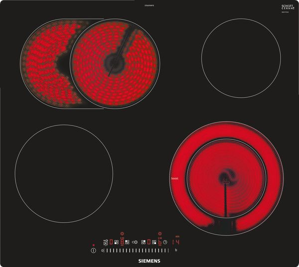 Erforderlicher Ausschnitt für die Installation (HxBxT mm): 51 x 576 x 516 60 cm: Platz für 4 Töpfe oder Pfannen Flexibilität der Kochzonen Bräterzone: Extra zuschaltbare Kochzone für großes Bratgeschirr Zweikreis-Kochzone: Verwenden Sie normales oder größeres Kochgeschirr für die erweiterbare Kochzone. Kochzone vorne links: 180 mm, 2 kW Kochzone hinten links: 265 mm, 170 mm, 1.8 kW Kochzone hinten rechts: 145 mm, 1.2 kW Kochzone vorne rechts: 210 mm, 145 mm, 1.2 kW (maximale Leistung 3 kW) Benutzerfreundlichkeit touchSlider: Steuern Sie die Leistung direkt mit der aufgedruckten Touch-Leiste. 17 Leistungsstufen: Stelle die Hitze mit 17 Leistungsstufen (9 Hauptstufen und 8 Zwischenstufen) präzise ein. Timer mit Abschaltfunktion: Schaltet die Kochzone am Ende der eingestellten Zeit aus (z. B. bei gekochten Eiern). Timer: Am Ende der eingestellten Zeit ertönt ein Signal (z. B. beim Pastakochen). Zeitersparnis und Effizienz Powerstufe: powerBoost-Funktion vorne rechts - bringt Wasser dank 20 % mehr Energiezufuhr schneller zum Kochen als auf höchster Normalstufe. reStart: Im Falle von unbeabsichtigtem Ausschalten des Kochfeldes bleiben alle Einstellungen erhalten, wenn du innerhalb von 4 Sekunden wieder einschaltest. Design Rahmen: Flächenbündiges Design Sicherheit 2-stufige Restwärmeanzeige je Kochzone: Zeigt an, welche Kochzonen noch heiß oder warm sind. Kindersicherung: Verhindert eine unbeabsichtigte Aktivierung des Kochfeldes. Wischschutzfunktion: Übergekochte Flüssigkeiten abwischen, ohne die Einstellungen unbeabsichtigt zu ändern (30 Sekunden sind alle Touch-Tasten blockiert). Hauptschalter: Alle Kochzonen auf einmal ausschalten. Betriebsanzeigelampe: Zeigt an, ob das Kochfeld heizt. Automatische Sicherheitsabschaltung: Aus Sicherheitsgründen schaltet sich das Kochfeld nach einer voreingestellten Zeit ohne Interaktion automatisch ab. Energieverbrauchsanzeige: Zeigt den Stromverbrauch des letzten Kochvorgangs an. Installation Maße des Gerätes (HxBxT mm): 51 x 572 x 512 Minimale Arbeitsplattenstärke: 16 mm Gesamtanschlusswert: 8300 W Zur Installation in Arbeitsplatten aus Stein, Granit oder Kunststoff. Andere Arbeitsplattenmaterialien erfordern eine Eignungsprüfung beim Hersteller der Arbeitsplatte.