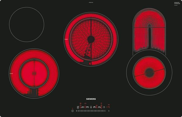 Erforderlicher Ausschnitt für die Installation (HxBxT mm): 51 x 796 x 516 80 cm: Platz für 4 Töpfe oder Pfannen Flexibilität der Kochzonen Zweikreis-Kochzone mit zuschaltbarer Bräterzone: Extra zuschaltbare Kochzone für großes Bratgeschirr Zweikreis-Kochzone: Verwenden Sie normales oder größeres Kochgeschirr für die erweiterbare Kochzone. Kochzone vorne links: 210 mm, 120 mm, 0.8 kW (maximale Leistung 2.6 kW) Kochzone hinten links: 145 mm, 1.2 kW Kochzone hinten: 180 mm, 230 mm, 2.4 kW (max. Leistung 3.4 kW) Kochzone vorne rechts: 350 mm, 145 mm, 200 mm, 0.9 kW Benutzerfreundlichkeit touchSlider: Steuern Sie die Leistung direkt mit der aufgedruckten Touch-Leiste. 17 Leistungsstufen: Stelle die Hitze mit 17 Leistungsstufen (9 Hauptstufen und 8 Zwischenstufen) präzise ein. Timer mit Abschaltfunktion: Schaltet die Kochzone am Ende der eingestellten Zeit aus (z. B. bei gekochten Eiern). Timer: Am Ende der eingestellten Zeit ertönt ein Signal (z. B. beim Pastakochen). Zeitersparnis und Effizienz Powerstufe: vorne links, Hinten mitte - bringt Wasser dank 20 % mehr Energiezufuhr schneller zum Kochen als auf höchster Normalstufe. reStart: Im Falle von unbeabsichtigtem Ausschalten des Kochfeldes bleiben alle Einstellungen erhalten, wenn du innerhalb von 4 Sekunden wieder einschaltest. Design Rahmen: Flächenbündiges Design Sicherheit 2-stufige Restwärmeanzeige je Kochzone: Zeigt an, welche Kochzonen noch heiß oder warm sind. Kindersicherung: Verhindert eine unbeabsichtigte Aktivierung des Kochfeldes. Wischschutzfunktion: Übergekochte Flüssigkeiten abwischen, ohne die Einstellungen unbeabsichtigt zu ändern (30 Sekunden sind alle Touch-Tasten blockiert). Hauptschalter: Alle Kochzonen auf einmal ausschalten. Betriebsanzeigelampe: Zeigt an, ob das Kochfeld heizt. Automatische Sicherheitsabschaltung: Aus Sicherheitsgründen schaltet sich das Kochfeld nach einer voreingestellten Zeit ohne Interaktion automatisch ab. Energieverbrauchsanzeige: Zeigt den Stromverbrauch des letzten Kochvorgangs an. Installation Maße des Gerätes (HxBxT mm): 51 x 792 x 512 Minimale Arbeitsplattenstärke: 16 mm Gesamtanschlusswert: 9300 W Zur Installation in Arbeitsplatten aus Stein, Granit oder Kunststoff. Andere Arbeitsplattenmaterialien erfordern eine Eignungsprüfung beim Hersteller der Arbeitsplatte.