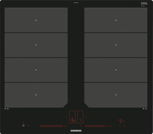 Erforderlicher Ausschnitt für die Installation (HxBxT mm): 56 x 576 x 516 60 cm: Platz für 4 Töpfe oder Pfannen Flexibilität der Kochzonen 2x varioInduktion: Verwenden Sie Kochgeschirr beliebiger Form und Größe innerhalb der 40 cm langen Zone. Kochzone vorne links: 240 mm, 190 mm, 2.2 kW (maximale Leistung 3.7 kW) Kochzone hinten links: 240 mm, 190 mm, 2.2 kW (maximale Leistung 3.7 kW) Kochzone hinten rechts: 240 mm, 190 mm, 2.2 kW (maximale Leistung 3.7 kW) Kochzone vorne rechts: 240 mm, 190 mm, 2.2 kW (maximale Leistung 3.7 kW) Benutzerfreundlichkeit Dual LightSlider-Bedienung: Steuern Sie die Leistung direkt über die beiden beleuchteten Touchleisten (im ausgeschalteten Zustand unsichtbar). 17 Leistungsstufen: Stellen Sie die Hitze mit 17 Leistungsstufen (9 Hauptstufen und 8 Zwischenstufen) präzise ein. Warmhaltefunktion: Warmhalten von Speisen bei voreingestellter niedriger Leistungsstufe. Timer mit Abschaltfunktion: Schaltet die Kochzone am Ende der eingestellten Zeit aus (z. B. bei gekochten Eiern). Timer: Am Ende der eingestellten Zeit ertönt ein Signal (z. B. beim Pastakochen). Laufzeitanzeige: zeigt an, wie viel Zeit seit dem Starten des Timers vergangen ist (z. B. beim Kochen mit Kartoffeln). Zeitersparnis und Effizienz powerBoost-Funktion für alle Induktions-Kochzonen möglich: Mit 50 % mehr Leistung z. B. Wasser schneller zum Kochen bringen als auf höchster Leistungsstufe. powerBoost-Funktion für Pfannen: Erhitzt Pfannen schneller als auf höchster normaler Leistungsstufe und schützt gleichzeitig die Pfannenbeschichtung. powerMove Plus: erhöht oder verringert die Leistung einfach durch Verschieben des Topfes nach vorne, in die Mitte oder nach hinten. quickStart: Beim Einschalten wählt das Kochfeld automatisch die Kochzone aus, auf dem im ausgeschaltetem Zustand Kochgeschirr aufgesetzt wurde. reStart: Im Falle von unbeabsichtigtem Ausschalten des Kochfeldes bleiben alle Einstellungen erhalten, wenn Sie innerhalb von 4 Sekunden wieder einschalten. Kochunterstützung Bratsensor Plus mit 5 Temperaturstufen: Verhindert ein Anbrennen durch die automatische Temperaturregelung des Sensors. Design Flächenbündiges Design Sicherheit 2-stufige Restwärmeanzeige je Kochzone: Zeigt an, welche Kochzonen noch heiß oder warm sind. Kindersicherung: Verhindert eine unbeabsichtigte Aktivierung des Kochfeldes. Wischschutzfunktion: Übergekochte Flüssigkeiten abwischen, ohne die Einstellungen unbeabsichtigt zu ändern (30 Sekunden sind alle Touch-Tasten blockiert). Hauptschalter: Alle Kochzonen auf einmal ausschalten. Automatische Sicherheitsabschaltung: Aus Sicherheitsgründen schaltet das Kochfeld nach einer voreingestellten Zeit ohne Interaktion automatisch ab. Energieverbrauchsanzeige: Zeigt den Stromverbrauch des letzten Kochvorgangs an. Installation Maße des Gerätes (HxBxT mm): 56 x 572 x 512 Minimale Arbeitsplattenstärke: 16 mm Gesamtanschlusswert: 7400 W powerManagement Funktion: Bei Bedarf die maximale Leistung begrenzen (abhängig von der Absicherung der Elektroinstallation). Netzkabel: 110 cm, Anschlusskabel beigelegt in Verpackung Zur Installation in Arbeitsplatten aus Stein, Granit oder Kunststoff. Andere Arbeitsplattenmaterialien erfordern eine Eignungsprüfung beim Hersteller der Arbeitsplatte.