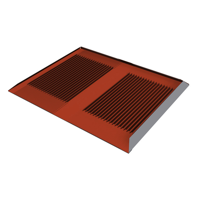 Gewalztes Aluminiumblech, Gummimanschette aus EPDM, Aluminium (Konsole, Klemmkombination, Schnee- bzw. Eisabweiser) und Stahl verzinkt (Stützblech), Abgedichtet durch aufgenietete Gummimanschette aus UVbeständigem EPDM und hochgekantete Plattenseiten, Geeignet für hohe Schneelast (bis 1.500 kg), In den Vertiefungen der Riffelungen entstehen windberuhigte Zonen, dadurch fließt das Wasser nach unten inLängsrichtung ab